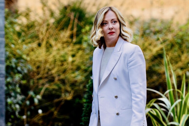 Giorgia Meloni in un punto stampa nella residenza