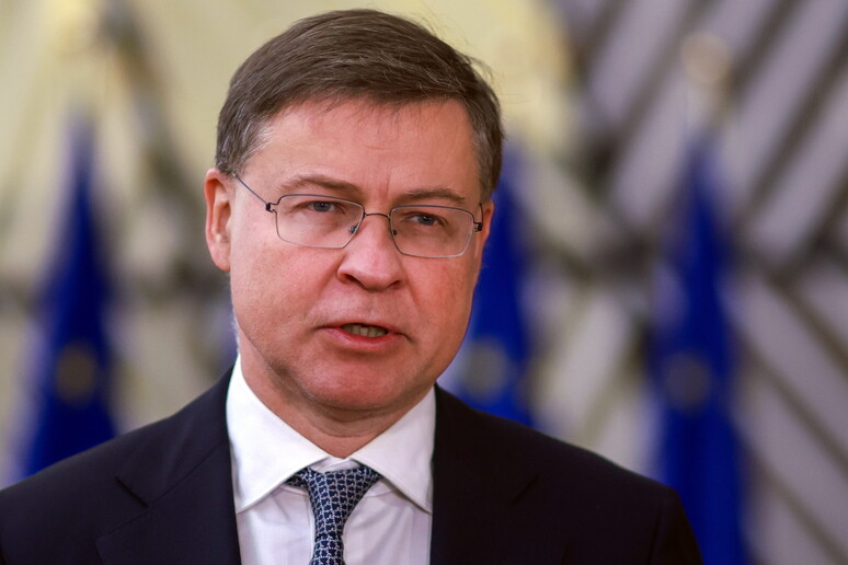 all'Economia Valdis Dombrovskis nella conferenza stampa al