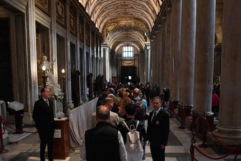 fedeli scorrono lungo una transenna fino alla tomba,semplice